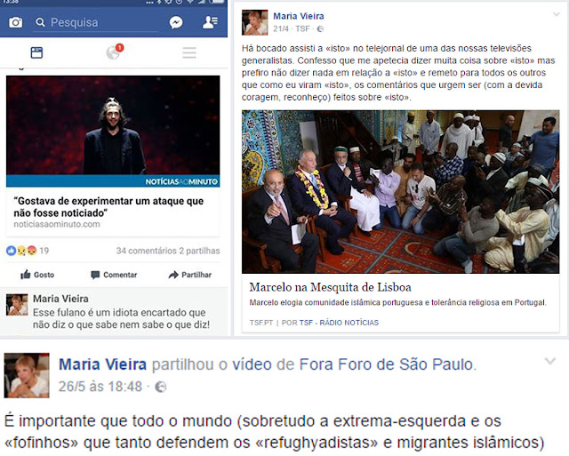 Há outra parte em que ela diz o Mourinho ter ganho a Liga Europa devia ter sido notícia de abertura em vez de notícias de terrorismo e que se fosse o Cristiano ou o Salvador já seriam notícia porque Mourinho é frontal não agrada ao poder instituído. Risada. Não estará lembrada quando interromperam a entrevista do Santana Lopes para mostrar a chegada de Mourinho ao aeroporto. Como todas as pessoas de pouca inteligência, a Maria é incoerente. Critica o Salvador por dizer que os ataques terroristas não deviam ter tanto destaque nos media, mas depois diz que o Mourinho é que devia abrir o telejornal e faz post sim, post sim sobre terrorismo. Todo o discurso dela se prende, sobretudo, sobre os refugiados que ela acha que devem ser deixados a morrer que é para se poupar vidas na Europa, porque as vidas do pessoal mais castanho valem menos. Pelo menos foi o que eu percebi do que ela diz. É fervorosa apoiante de Trump e com um piquinho de preconceito contra o Islão. Esta última parte nem acho mal, eu também discrimino o Islão juntamente com todas as outras religiões.